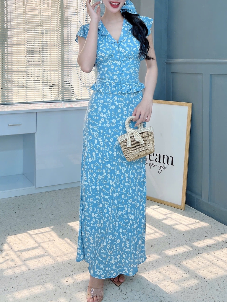 • Size S: Ngực 90 cm | Eo áo 60–90 cm | Eo váy 60–85 cm | Mông 100 cm | Vai 38 cm | Dài áo 45 cm | Dài váy 96 cm.