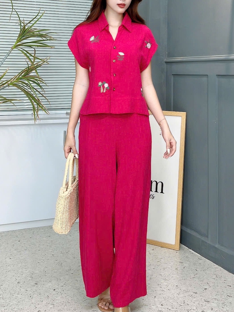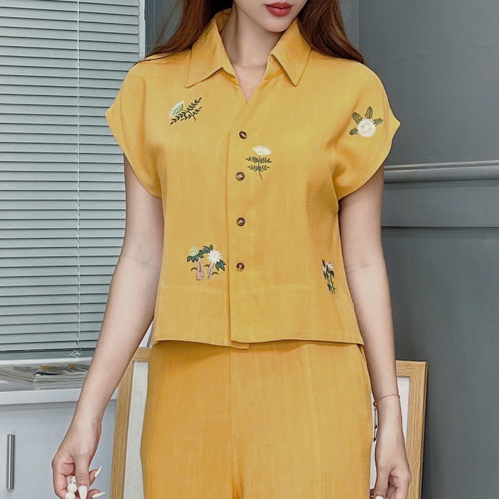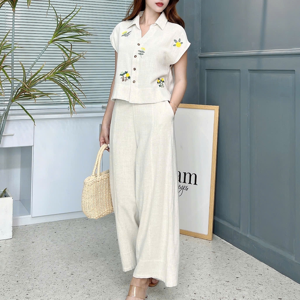 Set Áo Tay Ngắn Cổ Sơ Mi Thêu Hoa Mix Quần Dài Chất Linen Bamboo Thêu Đi Dạo Phố MIMIX - EW7
