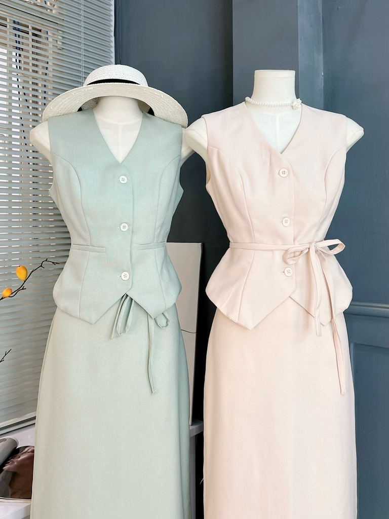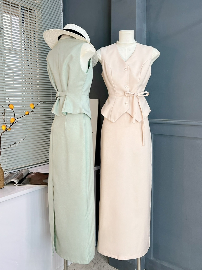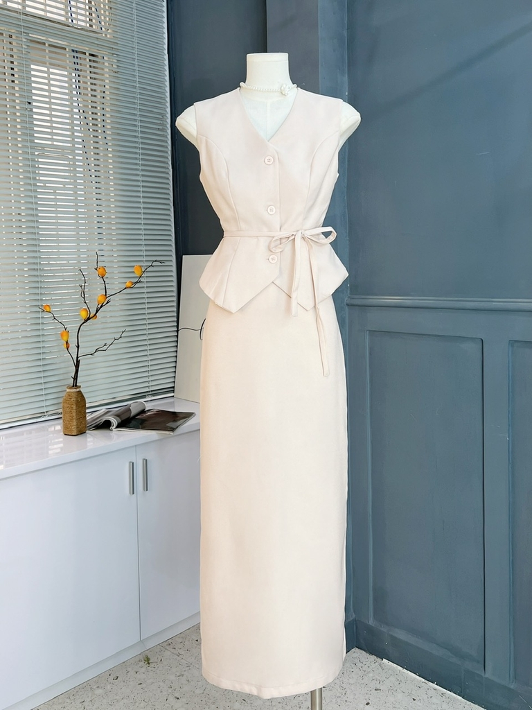 • Size S: V1: 86 cm, Eo áo: 70 cm, Eo váy: 66 cm, V3: 86 cm, Đường xẻ: 41 cm, Vai: 32 cm, Áo: 49 cm, Váy: 91 cm.