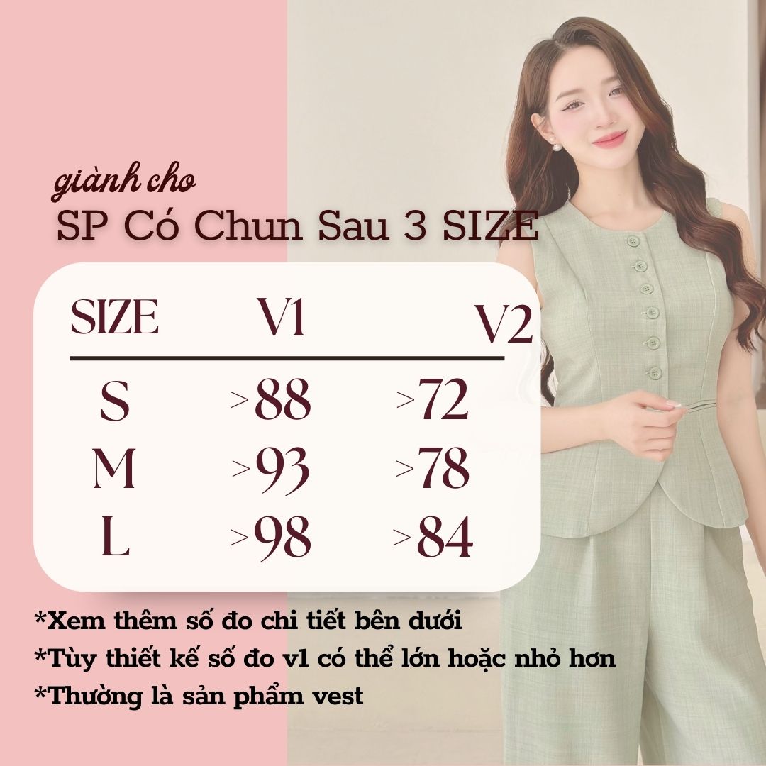 • Size S: Ngực 88 cm ; Eo áo 78 cm; Eo quần 66-80 cm ; Mông 110 cm; Đùi 66 cm; Ống quần 30 cm; Vai 39 cm ; Áo dài 57 cm; Quần dài 98 cm;